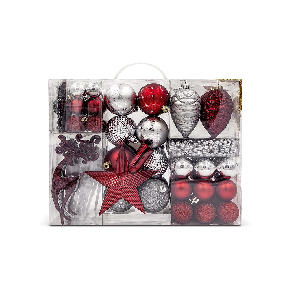 Decora il tuo Albero di Natale ed i tuoi ambienti grazie a questo Assortimento di Addobbi Natalizi di aTe Casa. Questo set comprende 100 elementi con decorazioni Natalizie di colore rosso, bianco e argento, infrangibili.