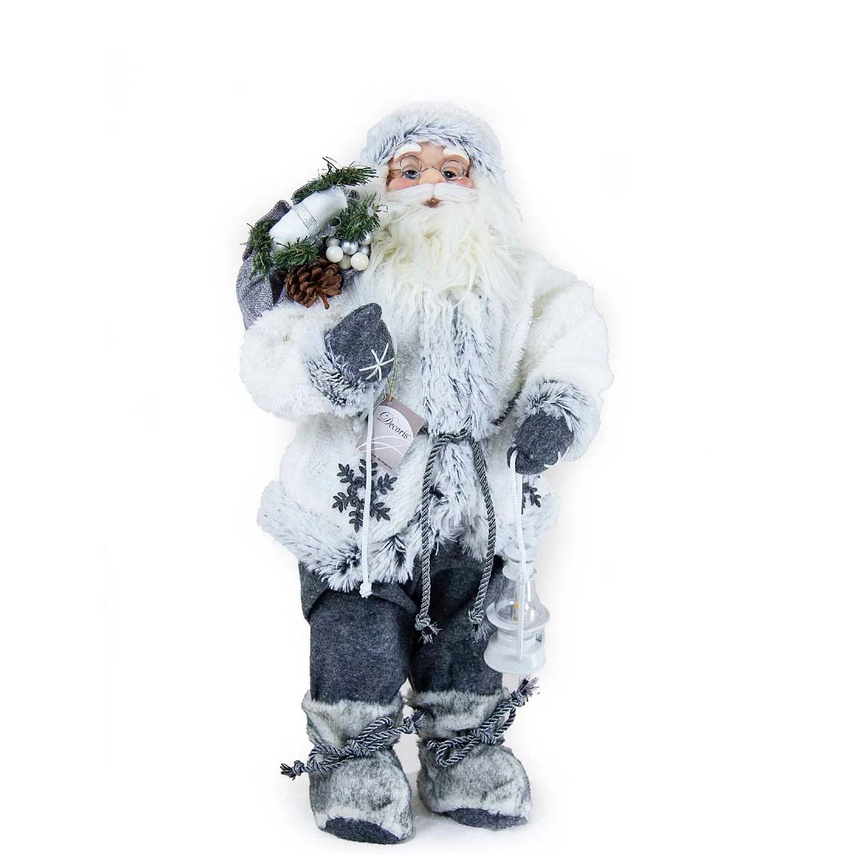 Il Babbo Natale con Vestito Bianco è la soluzione ideale per addobbare i tuoi ambienti domestici o i tuoi locali commerciali con un tocco di stile in più. Babbo Natale è riprodotto con uno spesso abito bianco e, provvisto di pantaloni grigi, tiene con una mano una lanterna, mentre con l’altra un sacco colmo di doni.