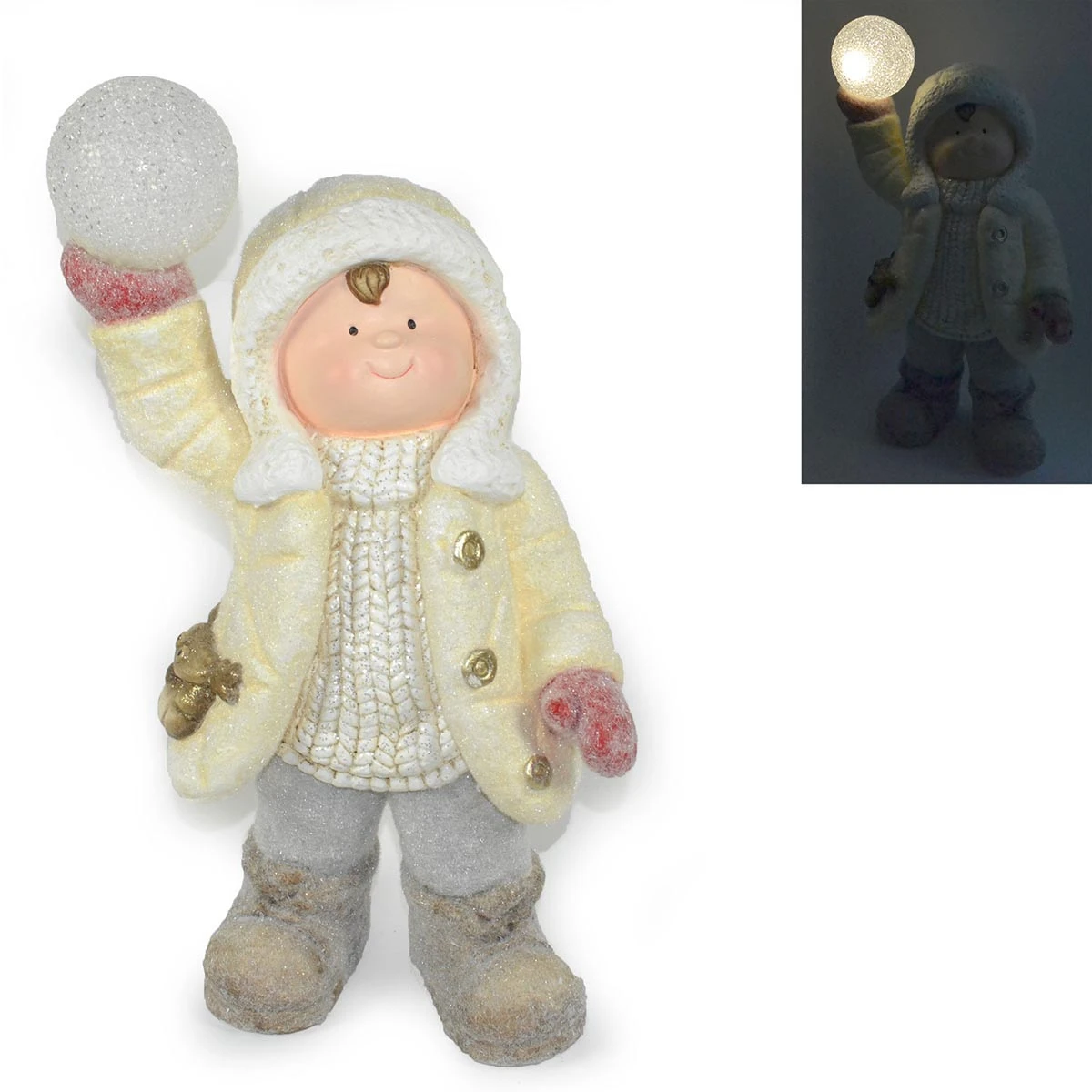 Bimbo in resina, con cappello beige e sfera che si illumina.
