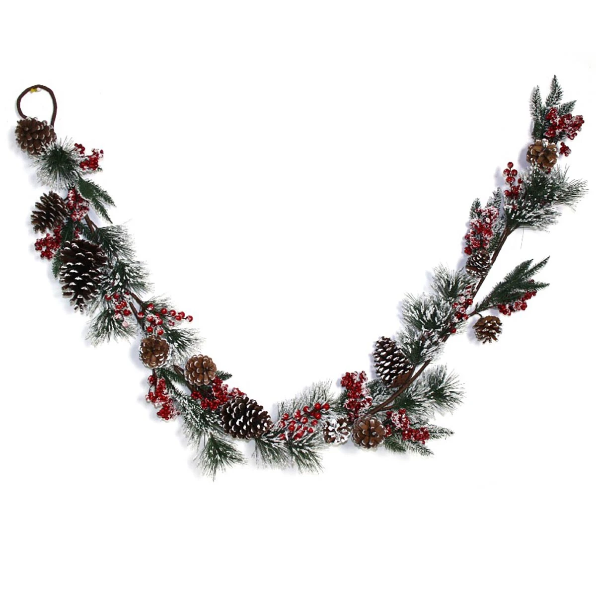 Ghirlanda Natalizia Innevata con Pigne e Bacche Rosse. Lunga 190 cm e dotata di gancio, è adatta alle decorazioni natalizie di porte, finestre e scale.